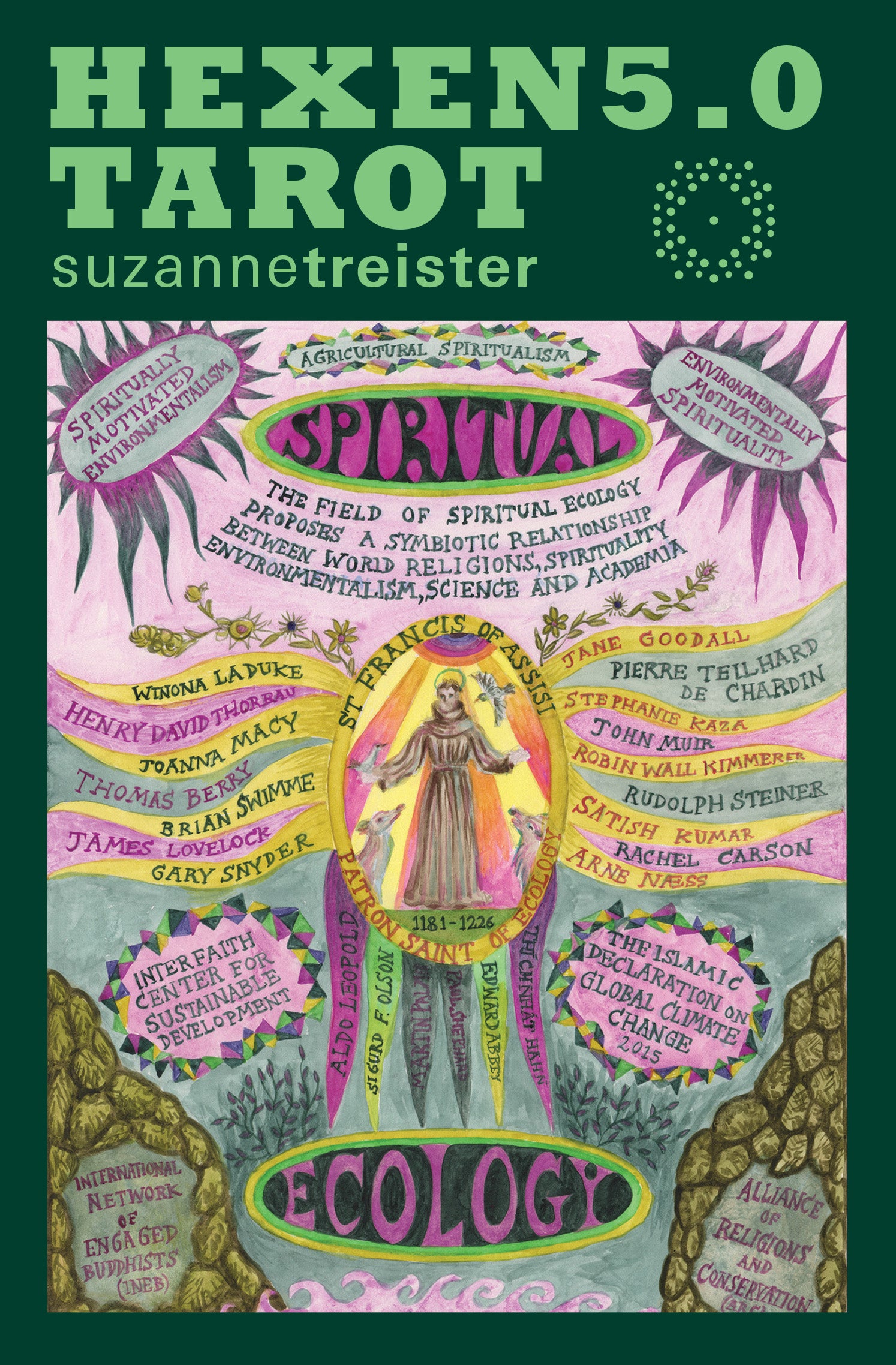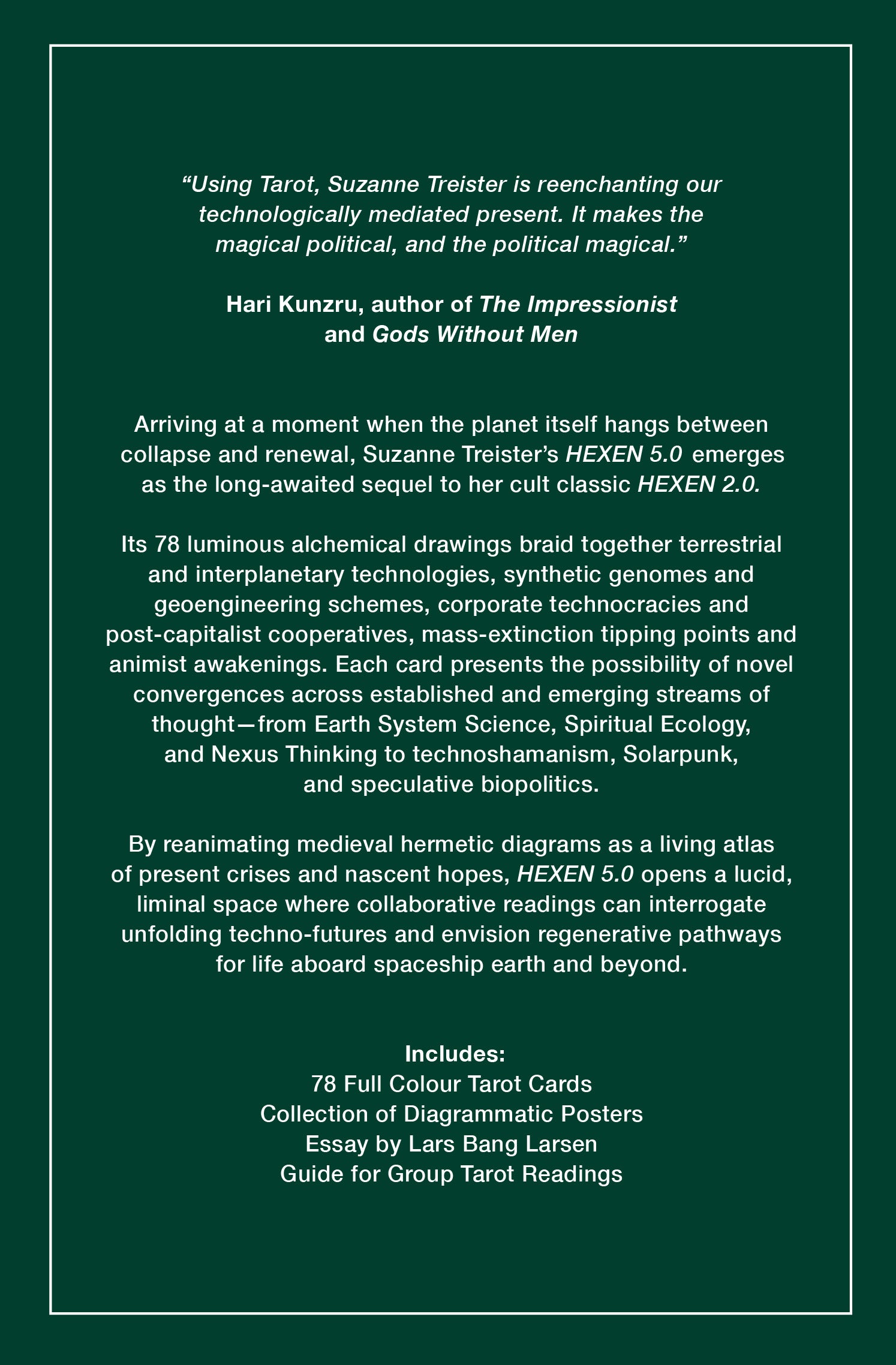 Its 78 luminous alchemical drawings braid together terrestrial and interplanetary technologies, synthetic genomes and geoengineering schemes, corporate technocracies and post-capitalist cooperatives, mass-extinction tipping points and animist awakenings. Each card presents the possibility of novel convergences across established and emerging streams of thought—from Earth System Science, Spiritual Ecology and Nexus Thinking to technoshamanism, Solarpunk, and speculative biopolitics.
